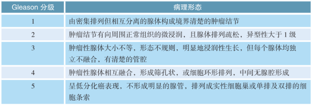 前列腺癌主要好发于前列腺外周带,约占70%,15%~25%起源于移行带,其余5%~10%起源于中央带;85%前列腺癌呈多灶性生长特点。2016年WHO出版的《泌尿系统及男性生殖器官肿瘤病理学和遗传学》中,前列腺癌病理类型包括腺癌(腺泡腺癌)、导管内癌、导管腺癌、尿路上皮癌、鳞状细胞癌、基底细胞癌以及神经内分泌肿瘤等。其中前列腺腺癌占主要部分,因此通常我们所说的前列腺癌是指前列腺腺癌。前列腺腺癌的病理分级推荐使用Gleason评分系统。该评分系统依据前列腺癌整体的组织结构,从细胞形态将前列腺癌恶性程度分为1级到5级,对癌灶中的不同组织形态区域分别评分,最后将主要评分和次要评分相加,得到Gleason评分,以此代表前列腺癌的恶性程度。图1 Gleason分级