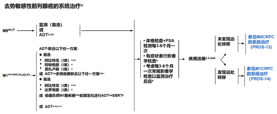 众所周知,前列腺癌治疗领域在十余年来不断取得新的突破。除手术、化疗、外放射治疗(EBRT)外,新型内分泌药物治疗、靶向药物、PARP抑制剂、核素治疗的应用均极大地提高了前列腺癌患者的生存和临床获益。如何使患者获益最大化,关键在于结合患者的疾病特征选择相应的药物及治疗方案。美国国家综合癌症网络(NCCN)在2023 V1版的前列腺癌指南中,重点更新了转移性去势敏感性前列腺癌(M1CSPC)、转移性去势抵抗性前列腺癌(M1CRPC)的系统治疗方案,具体方案见下图。图3 转移性去势敏感性前列腺癌的系统治疗