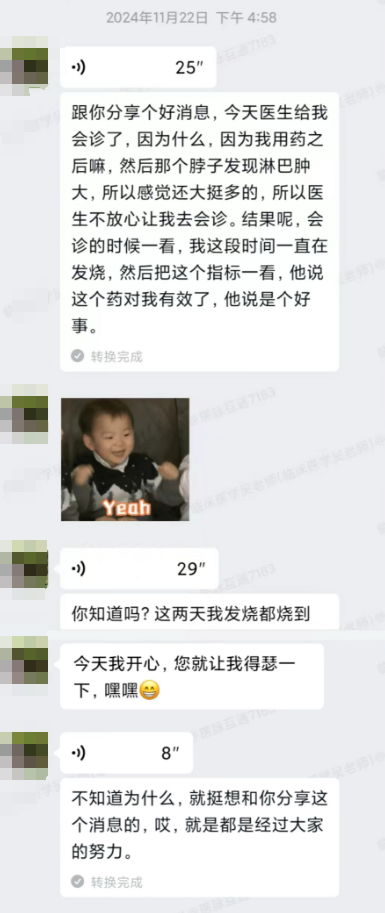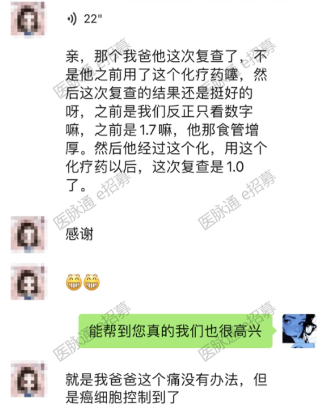 患者与项目的顺利连接,e招募医学组的老师们扮演着重要的角色。从患者报名,到第一次联系患者,耐心指导患者提交必备的资料,解答疑问,到最后成功参加项目,每一步都来之不易,需要患者的配合,需要老师对项目的了解、对患者情况的熟悉,才可以为患者节省时间,尽快地寻找最优解。