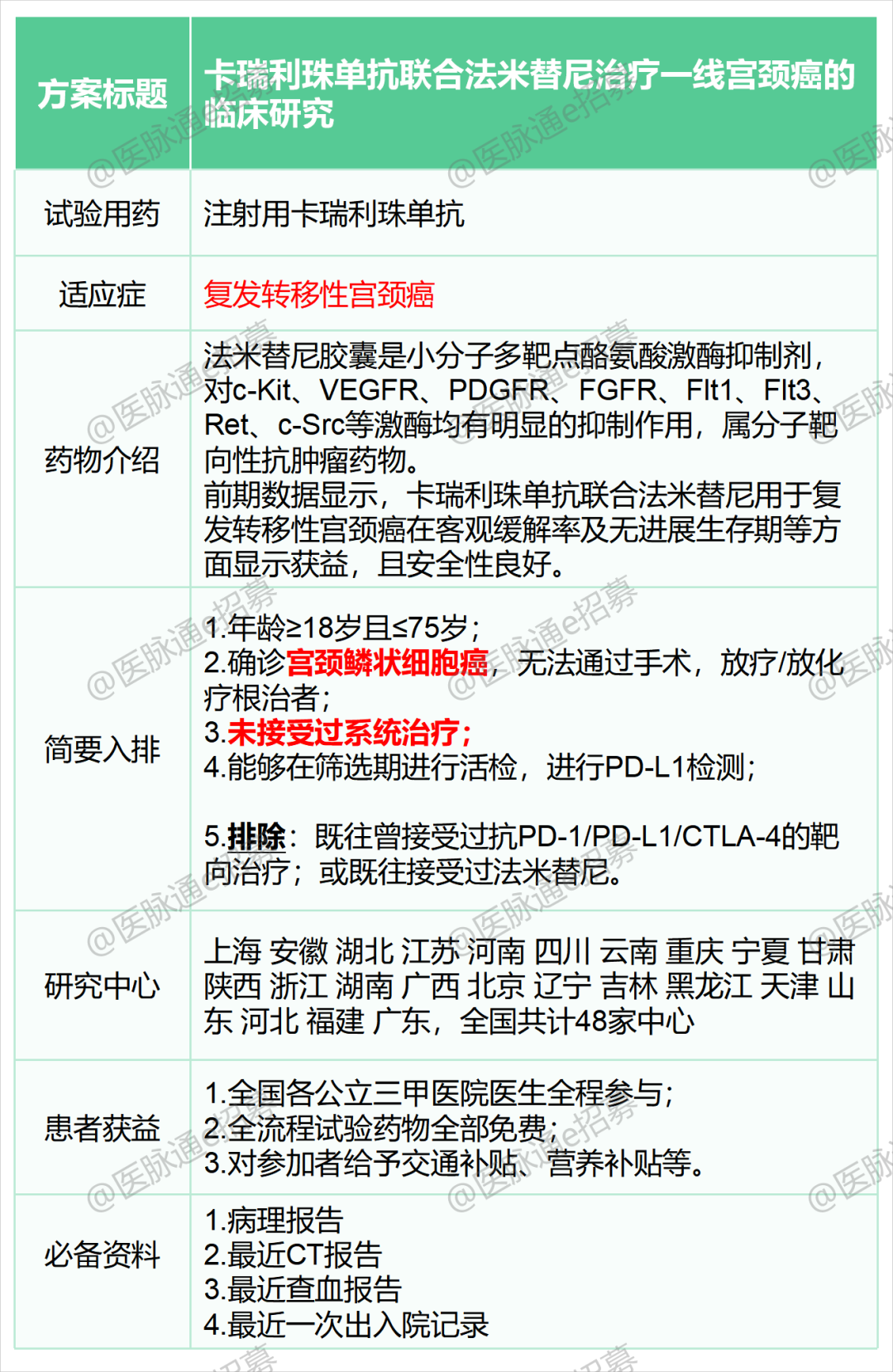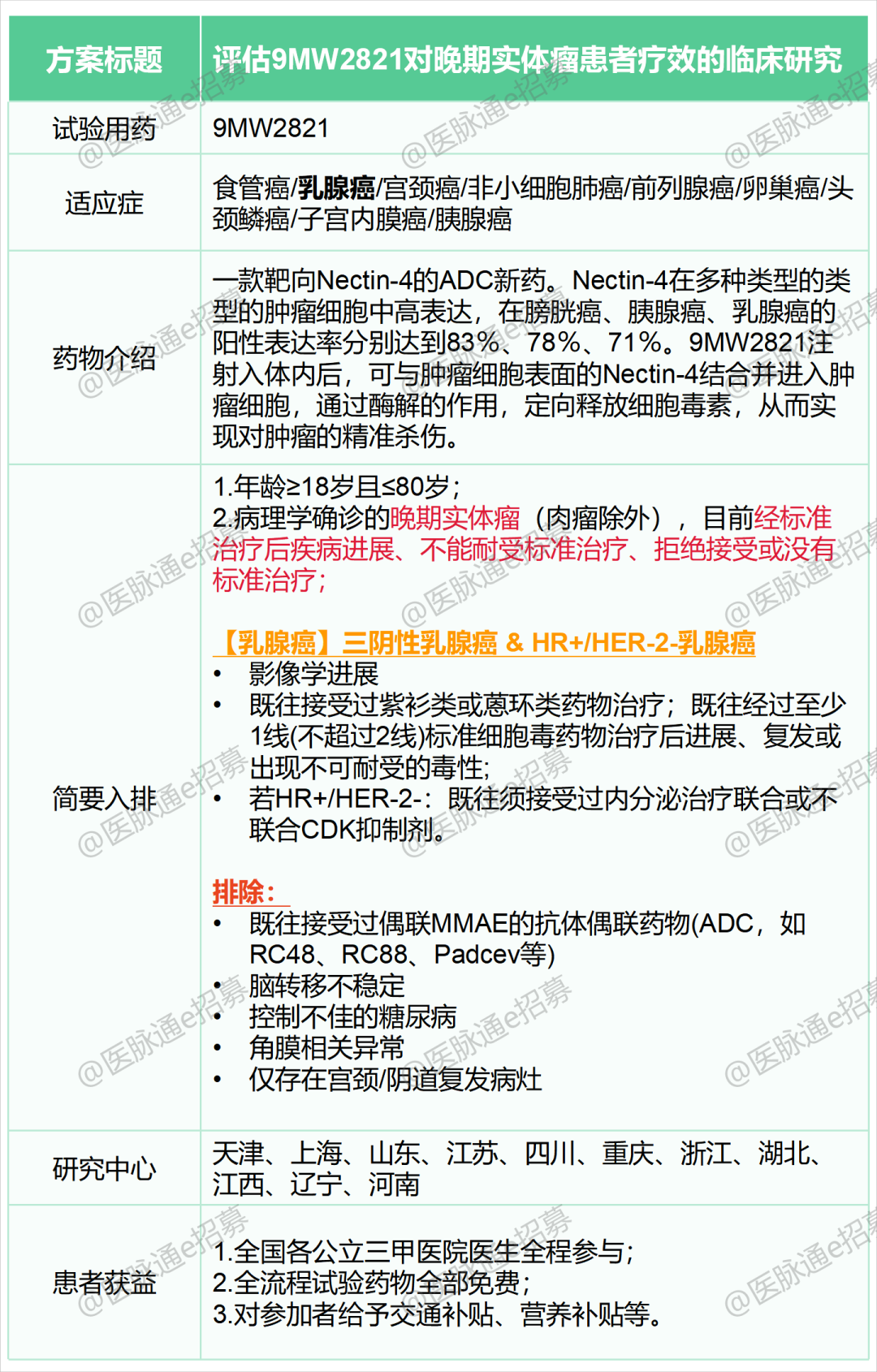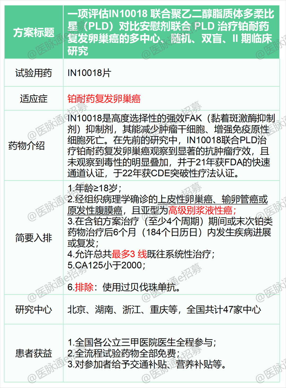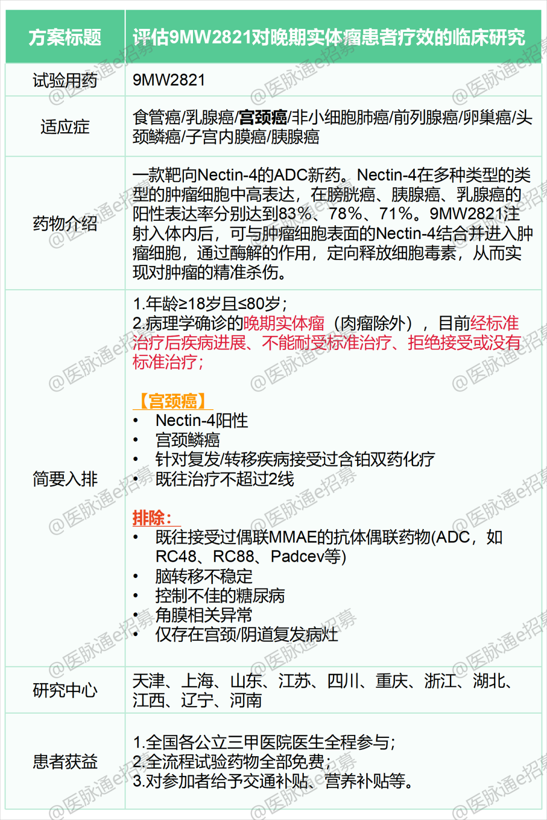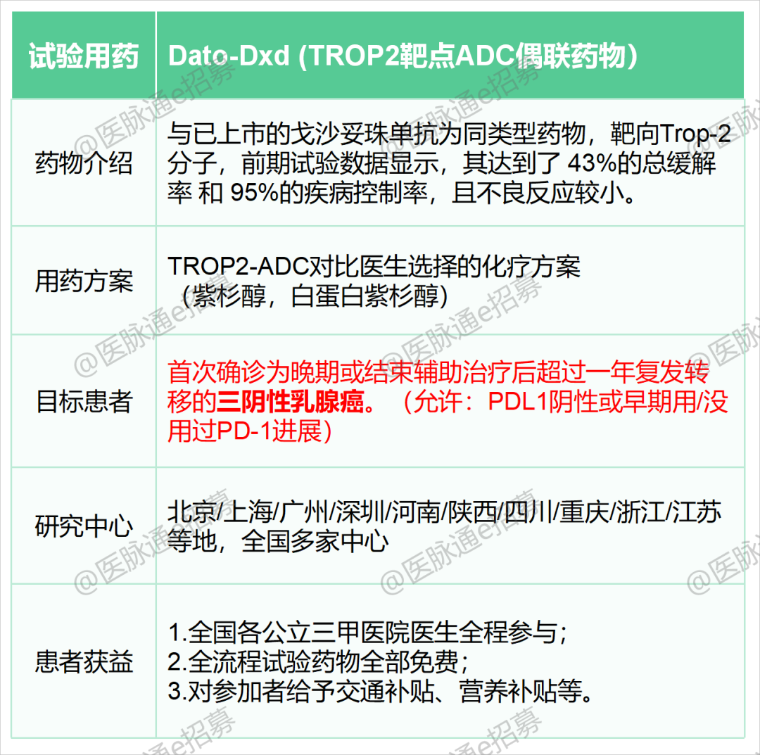 以下是小编为大家挑选的针对乳腺癌、宫颈癌和卵巢癌的临床试验项目,我们诚邀您参加,研究项目相关的检查和用药免费,并且在公立三甲医院接受治疗和随诊,有需要的患者可以联系我们报名。