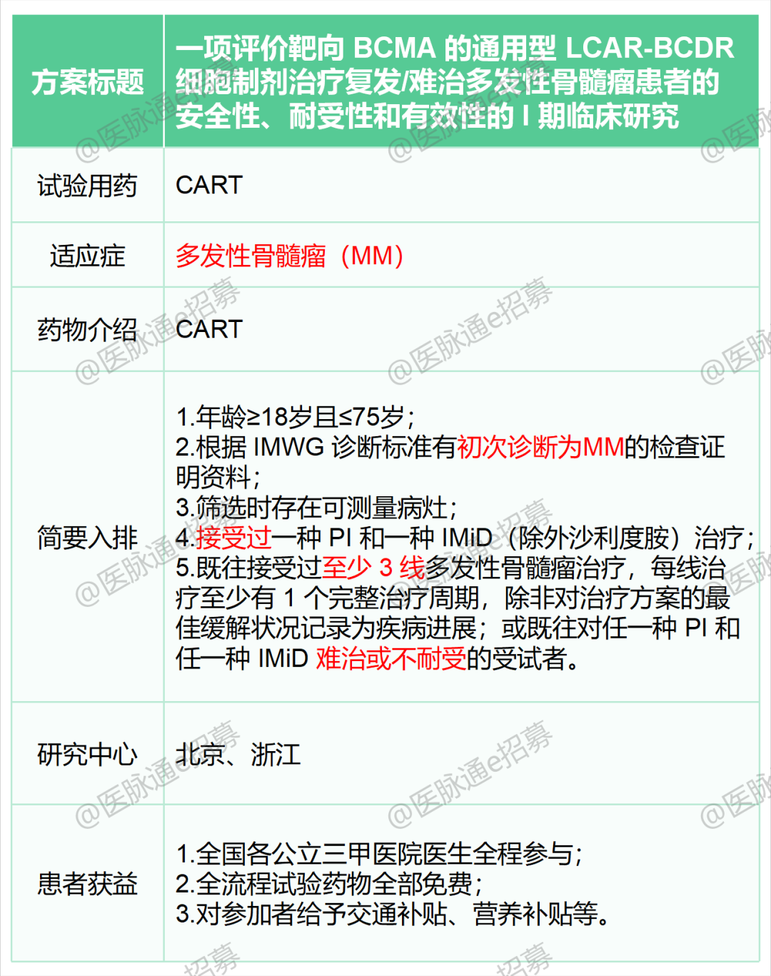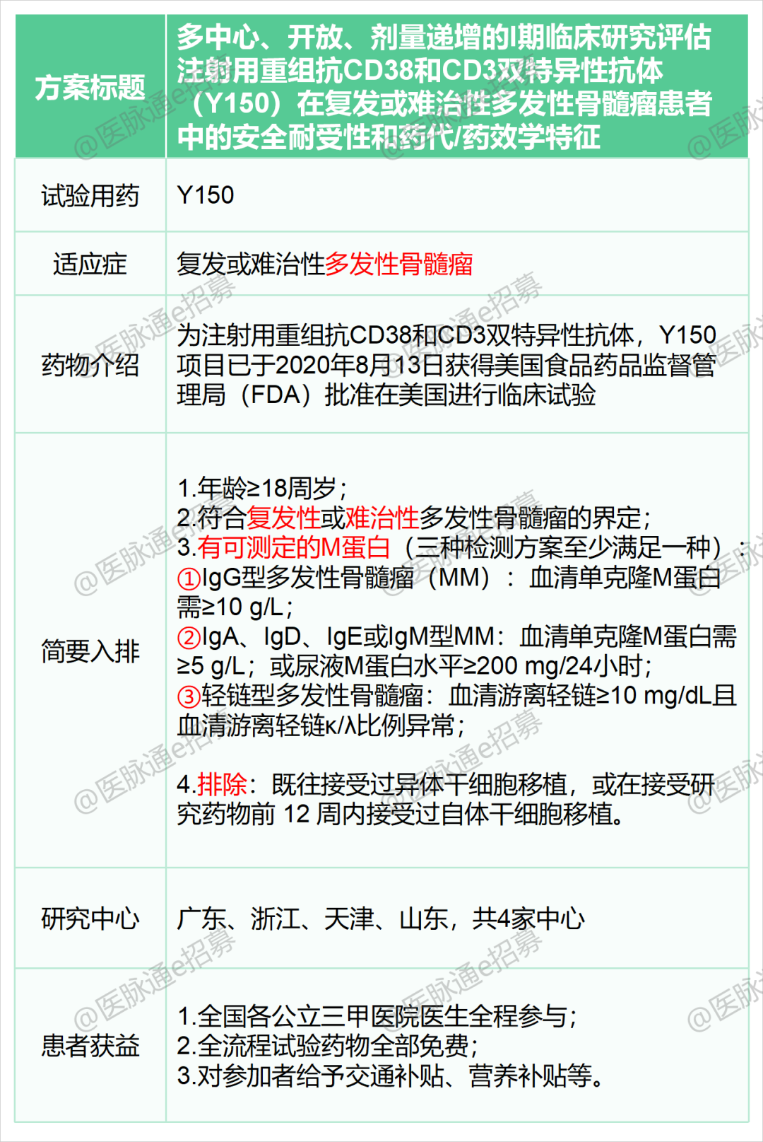 下面小编为大家介绍目前患者可免费申请使用的治疗多发性骨髓瘤的项目,点击下方链接即可报名,研究项目相关的检查和用药免费,并且在公立三甲医院接受治疗和随诊。