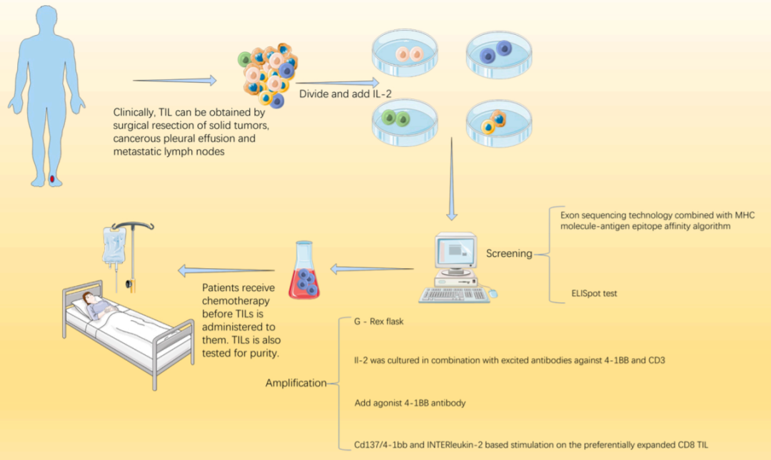 在TIL制备的早期阶段,只有分离、扩增和输血三个阶段,随着研究的深入,在扩增前增加了筛选步骤,大大提高了TIL的有效性。TIL制备的一般过程如下:医生首先通过手术获得新鲜的肿瘤组织。获得的组织应足够大,大于1cm3。然后克隆不同类型的T淋巴细胞,与白细胞介素-2(IL-2)共同培养,在白细胞介素-2刺激下T淋巴细胞增殖,形成细胞群,然后与肿瘤细胞反应,保留阳性细胞并且扩增肿瘤特异性TIL。患者在输血前接受化疗。