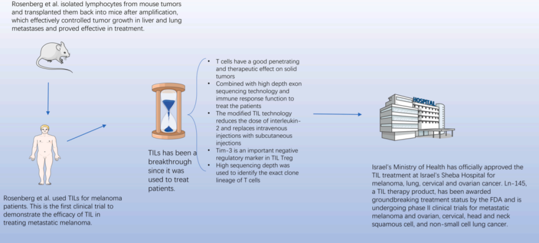 1982年,Rosenberg等人从小鼠肿瘤中分离出淋巴细胞,用白细胞介素-2(IL-2)扩增技术将其移植到体外,有效地控制了肝、肺转移瘤的生长。在一些小鼠中,转移性肿瘤和原发肿瘤完全消失,表明TIL具有显著的疗效。Rosenberg随之将其应用于黑色素瘤患者。结果表明,TIL细胞联合IL-2和环磷酰胺治疗后,15例转移性黑色素瘤中有9例出现客观缓解,缓解时间为2~13个月,这是TIL治疗转移性黑色素瘤的首次临床试验,是TIL治疗转移性黑色素瘤的重大突破。