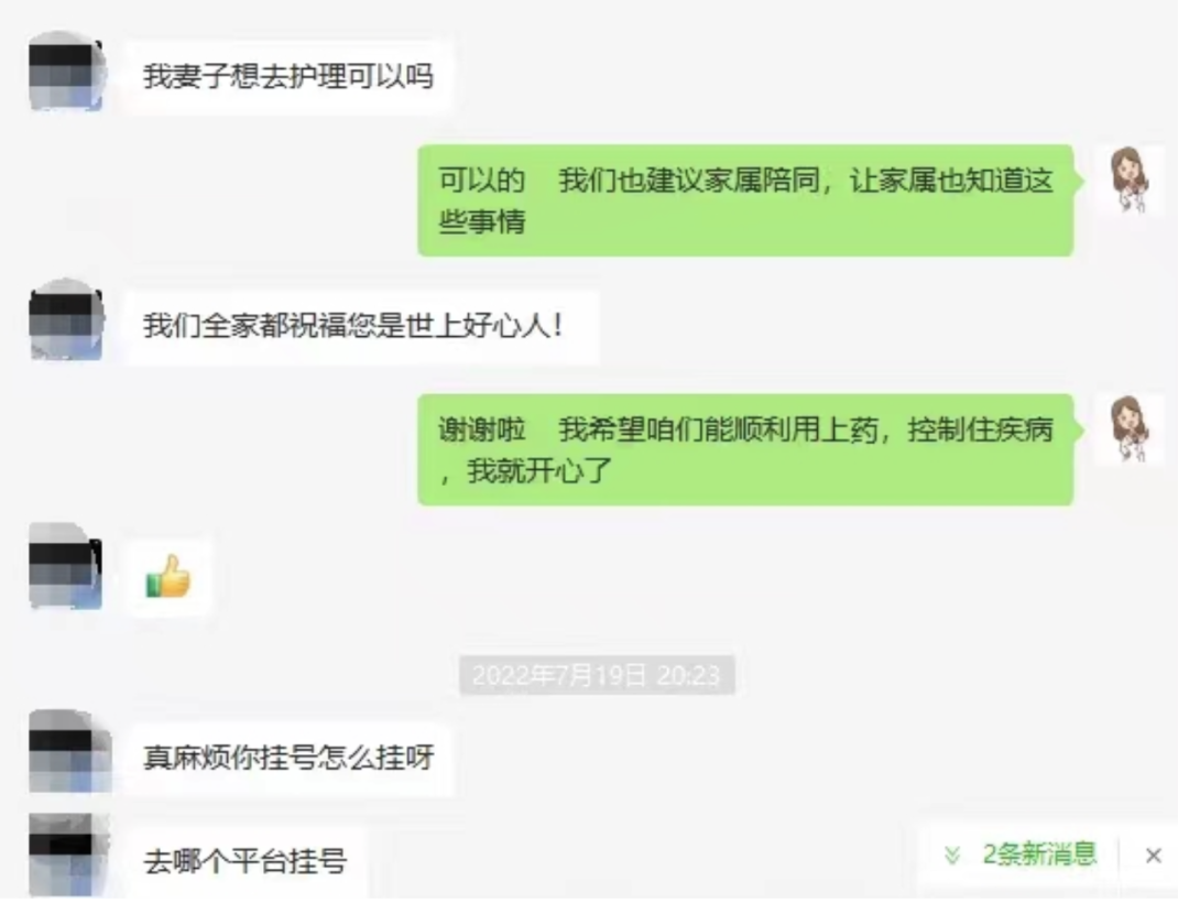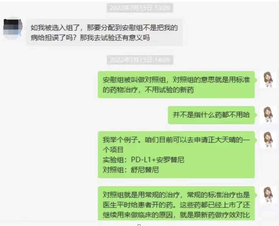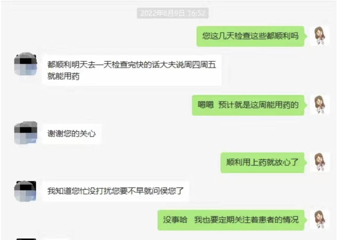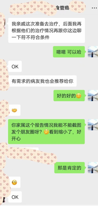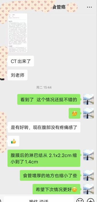 22年6月份,患者确诊时就已经出现了肺部转移,原发的位置还是选择做了切除手术,术后一直在家休养。因为经济及病情较重等原因,患者希望能使用比较前沿的治疗方案,所以申请了临床试验。7月14日。患者报名临床项目,与项目组老师取得联系。当时患者对参加临床试验了解有限,所以像大多数患者一样,也咨询了许多大家常问的疑虑,如:分到对照组怎么办?会不会只有安慰剂不用药?项目组会不会用假药给患者治疗?等等问题。项目组老师都耐心的给患者作了解答,医患信任也由此一点点建立了起来。患者从8月3日开始,到8月11日,完成了相关的检查,所有的结果于8月12日出来的,不巧赶上周五,所以用药就只能定在8月15日。很幸运,患者在8月15日成功的用上了药。至今,患者入组用药状态良好,经复查肿瘤病灶也有得到控制相应缩小,希望这位患者能够继续通过临床试验得到更多获益。这是一位确诊的食管鳞癌患者,确诊时已经没有手术指征了,因此没有手术,后续经过了化疗,靶向,免疫进行治疗。今年8月中下旬,患者出现了疾病进展,药物耐药了,由于之前已经使用过了化疗、靶向药和免疫治疗,现在的患者已经没有标准的推荐治疗方案了。患者和家属想尽了一切办法,期望给患者寻找到新的治疗方案,家属第一时间找到项目组老师,老师当天收集齐备所有病史资料,匹配了食管鳞癌项目。患者家属去之前也是给老师打了很多次电话,因为患者多处有肿瘤,很担心药物疗效问题,担心耽误病情等,医学组老师和家属一一沟通后,家属很配合的去了指定的三甲医院见研究医生;经历半个月的共同配合,患者9月初正式进入临床研究并且成功用上了创新药物。现在,患者已经做了第一次肿瘤疗效评估,复查结果提示腹膜后淋巴病灶从之前的2.1x2.2cm缩小到了1.4cm。据家属反馈,患者的疼痛感也有好转;家属还提到,以前挂不到的专家号,现在专家每天都会来详细地询问病情,入院、做检查、治疗也有相应的临床项目组工作人员陪同,而且全程的药物和检查都是免费的,每次住院下来也就自付了100元/日的住院费和护理费,相比以前,家庭的经济负担已经减轻了不少。临床研究的匹配带给了患者和家属新的治疗方案和希望,希望这位患者之后的转移淋巴结以及疼痛均能在参加临床试验过程中得到好转。👩⚕️:在抗争病魔的道路上,让我们一起携手向前冲!最后,分享 哈尔滨医科大学附属肿瘤医院 呼吸肿瘤内科 孟庆威教授曾在采访中的一段阐述:“在我们这样的时代,患者还是非常幸运的,因为在这个时期我们的国家经济上发展得特别快,同时我们的制药业也发展的特别快;很多的临床试验,包括我们的伦理等都和国际上接轨了,所以说在今天的患者能够在临床试验这种形势下,接触到在世界上先进的治疗,那么我们希望广大患者,应该正确的认识临床试验,积极地参加这样的一种治疗方式,从而能够使得自己的到更好的治疗效果。”